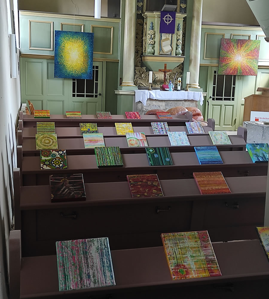 Die Kunstaktion in der Kirche Wolsdorf im Juni 2024 war für mich ein ganz besonderer Teil von Kultur Land Kirchen der Braunschweigischen Landschaft e.V. Meine Arbeiten durften in diesem außergewöhnlichen Raum ihre Wirkung entfalten und traten in einen spannenden Dialog mit der Architektur und der Atmosphäre der Kirche.